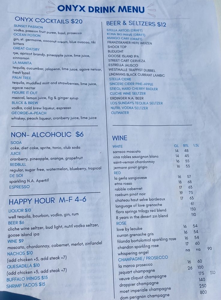 Introducing the menu at ONYX Rooftop Bar, a casual, trendy, and romantic spot in Santa Monica, CA. This rooftop bar offers a range of options, from chicken nuggets to coconut shrimp, catering to various tastes. The food menu includes favorites like olives, fries, and spring rolls, along with special dishes like Coco Shrimp and Coco Chicken. Pair your meal with a glass of Sonoma Chardonnay or Caymus white from their wine selection. The ambiance at ONYX Rooftop Bar is perfect for date nights, group gatherings, or relaxing evenings. With outdoor seating and a view of the water, it's a great place to unwind. The reviews highlight the cozy atmosphere and delicious cocktails, making it a must-visit destination. Give ONYX Rooftop Bar a try for a memorable dining experience.
